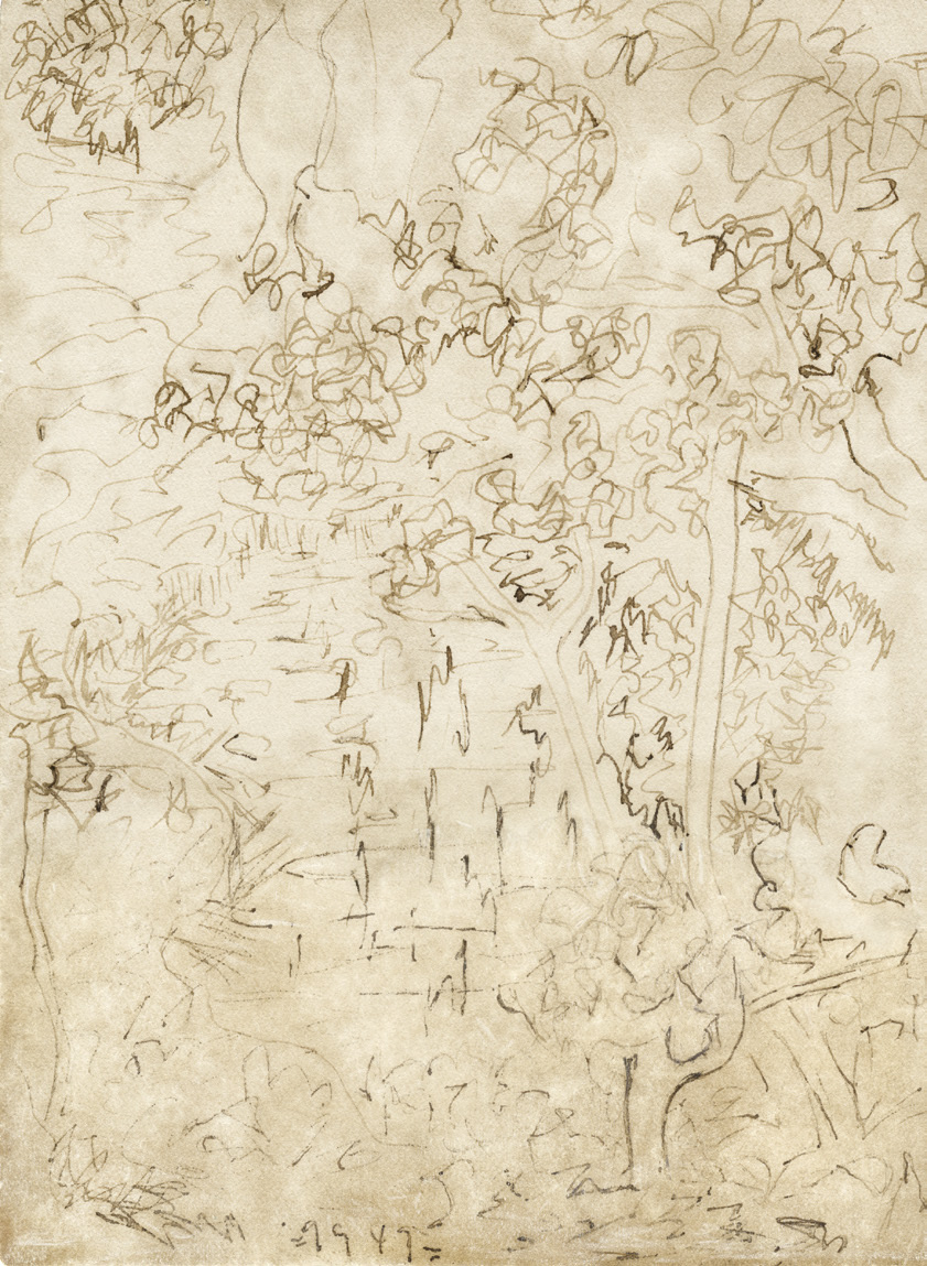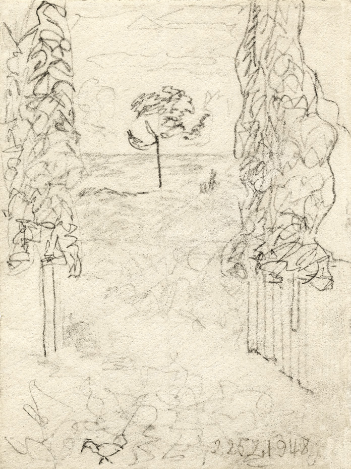 No desenho sem título, datado de 1948 (fig. 2), percebo alguns contrapontos ao exposto sobre o desenho de 1949. Feito a grafite, por sua natureza e potencialidades materiais, constitui-se por linhas aeradas e manchas incertas obtidas por esfumaçado. Não vemos o espaço tramado, mas uma clara intenção de abertura. Da porteira aberta, madeiro esculpido metamorfoseando-se em árvores que verticalizam a dinâmica, se forma o reenquadramento da árvore esguia e solitária no fundo breve. Difícil não atribuir à forma próxima ao fora de campo, do lado de cá, o reconhecimento de um pássaro. Ainda que, comparado à gramática familiar do chão ao redor, pareça ganhar ênfase e forma descritiva somente por um acento de matéria e tonalidade. Esta forma quase não figurou pássaro, mas é o suficiente para fechar a conta e estruturar pontos cardeais.