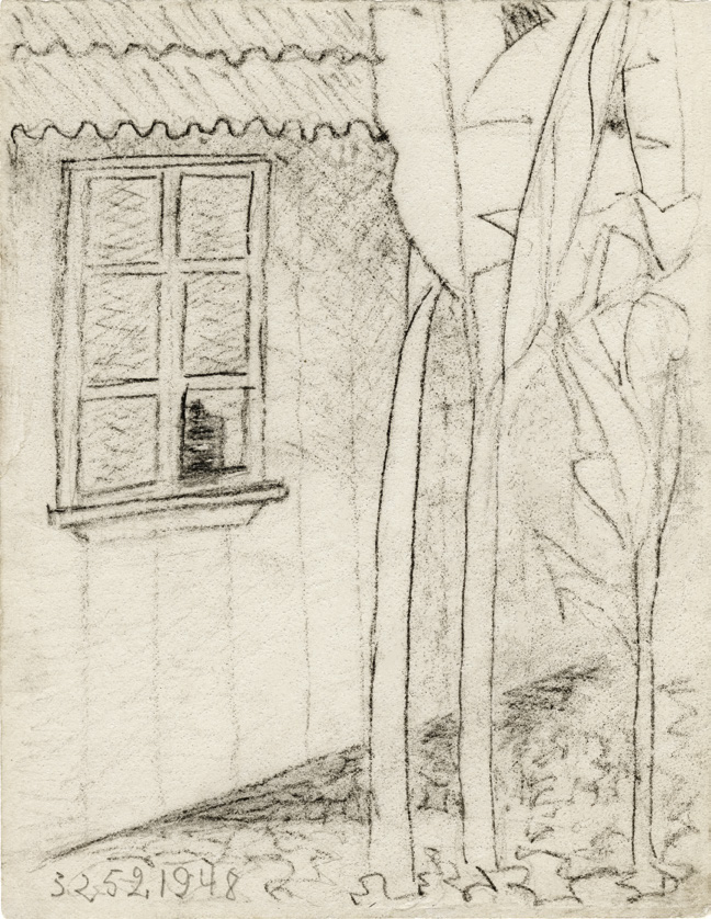 Interessante notar como, além dos motivos recorrentes como fundos de quintal, pequenas fachadas de casas com vegetações manifestam-se de forma pungente à posição oblíqua do olhar. Conforme podemos ver em outro desenho de 1948 (fig. 3) e no último desenho apresentado neste ensaio (fig. 4).