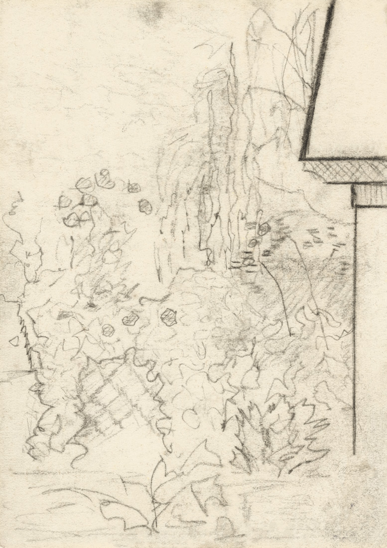 Em nosso último exemplo (fig. 4), o olhar oblíquo acompanha um possível movimento de desvio do corpo. Do contrário, para que serviria a presença de um resto de elemento arquitetônico feito de modo tão incisivo e que podemos, sem saída, perceber no canto direito do desenho? Esta estrutura me parece agir como um ponto de partida ou indicação de fuga. Em contraponto a esta construção firme e formas assertivas como a linha do telhado especialmente, agindo como uma seta, deparamo-nos novamente com esta experiência em que a natureza apresenta a possibilidade de lidar com formas que crescem à revelia. Difícil determinar aqui a diferença entre um jardim ou um canto abandonado, pois a força das tramas vai ligando as partes e os limites dos elementos formam a estrutura dos demais.