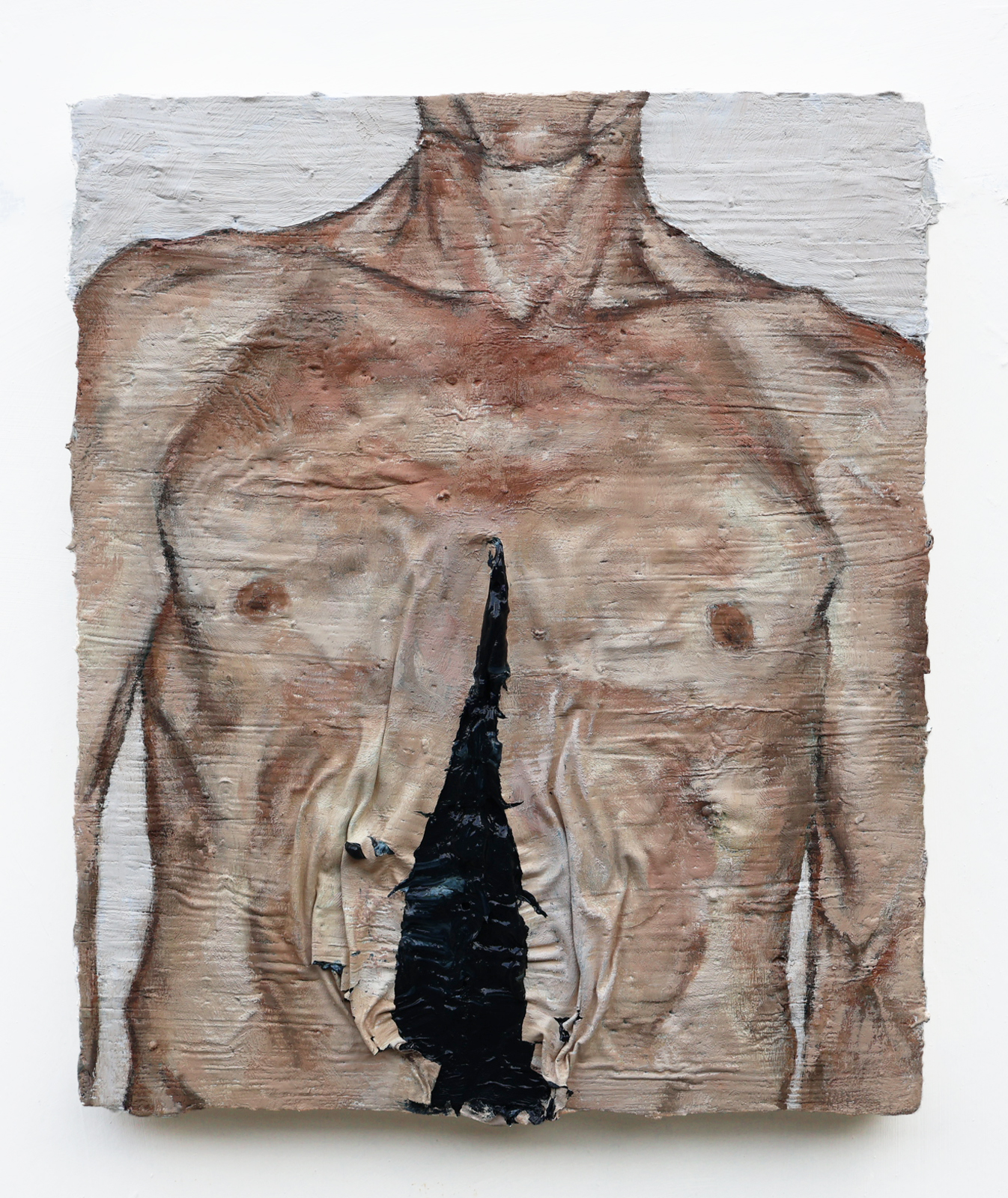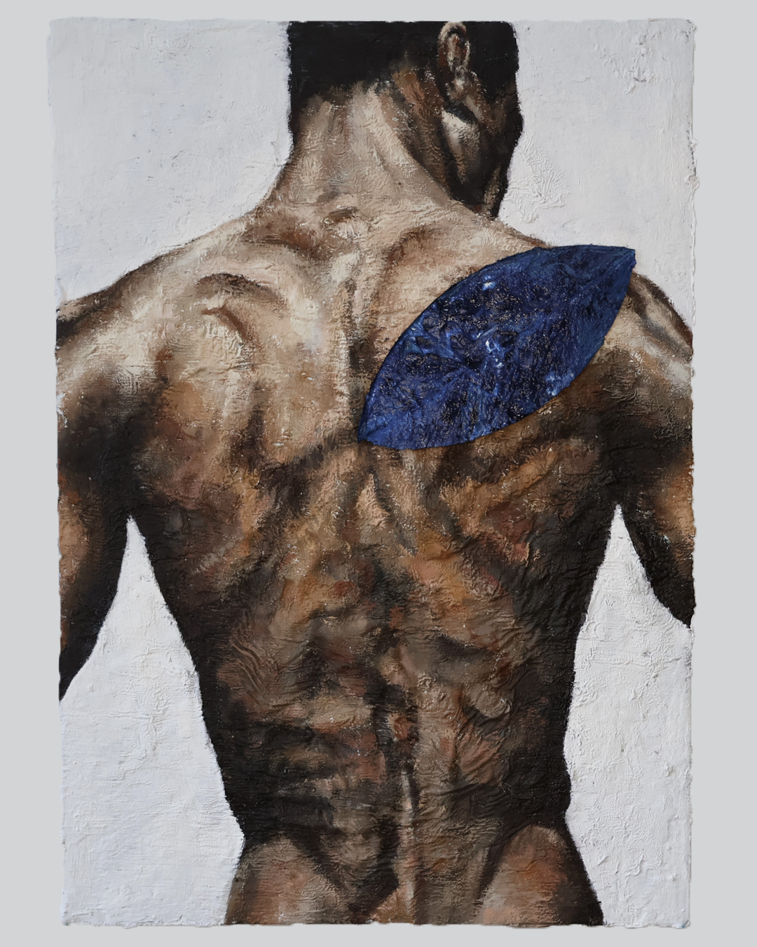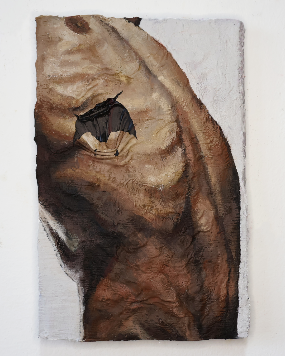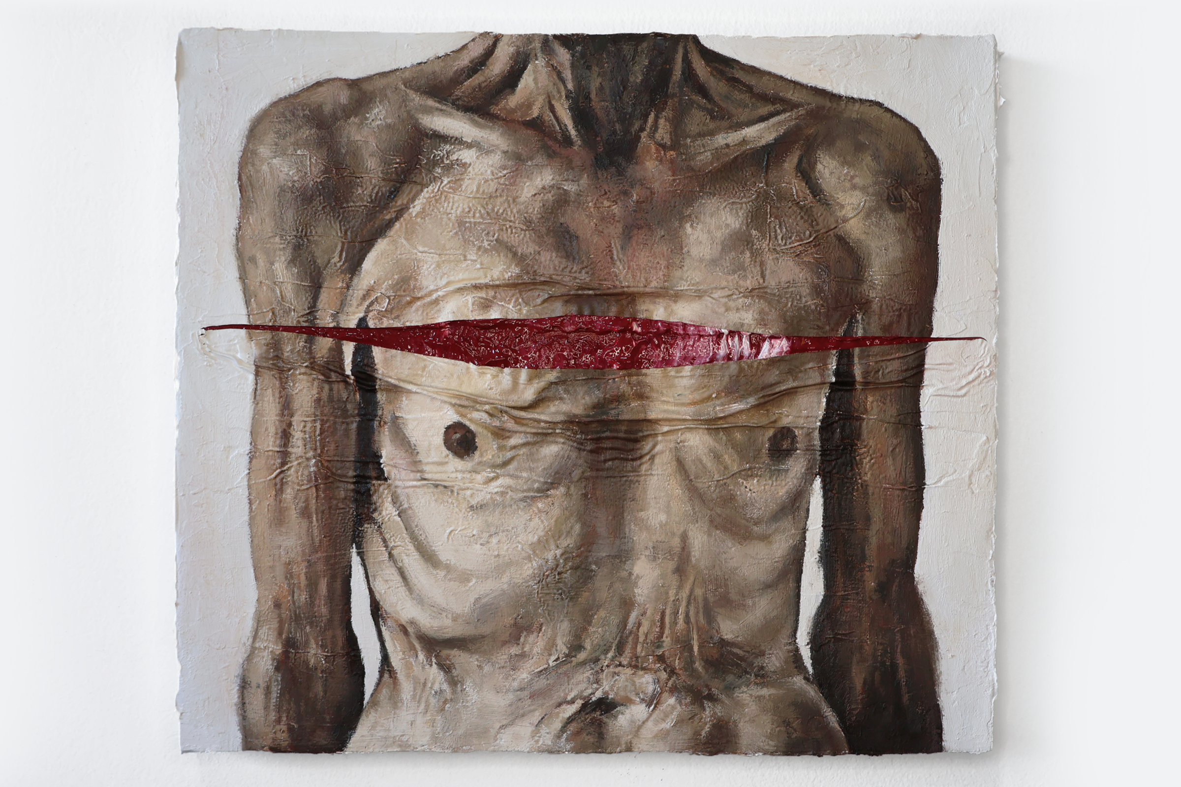 A pele, sempre em destaque, enfatiza a dimensão material e processual da pintura, na medida que é atravessada por cortes e dobras que revelam uma camada inferior, formada por tinta ainda úmida. Aparecem então, cores fortes – inclusive o vermelho, carregado de simbolismos – e as texturas marcantes, que afirmam a relação pintura-corpo, destacando a materialidade e significado da obra em si.