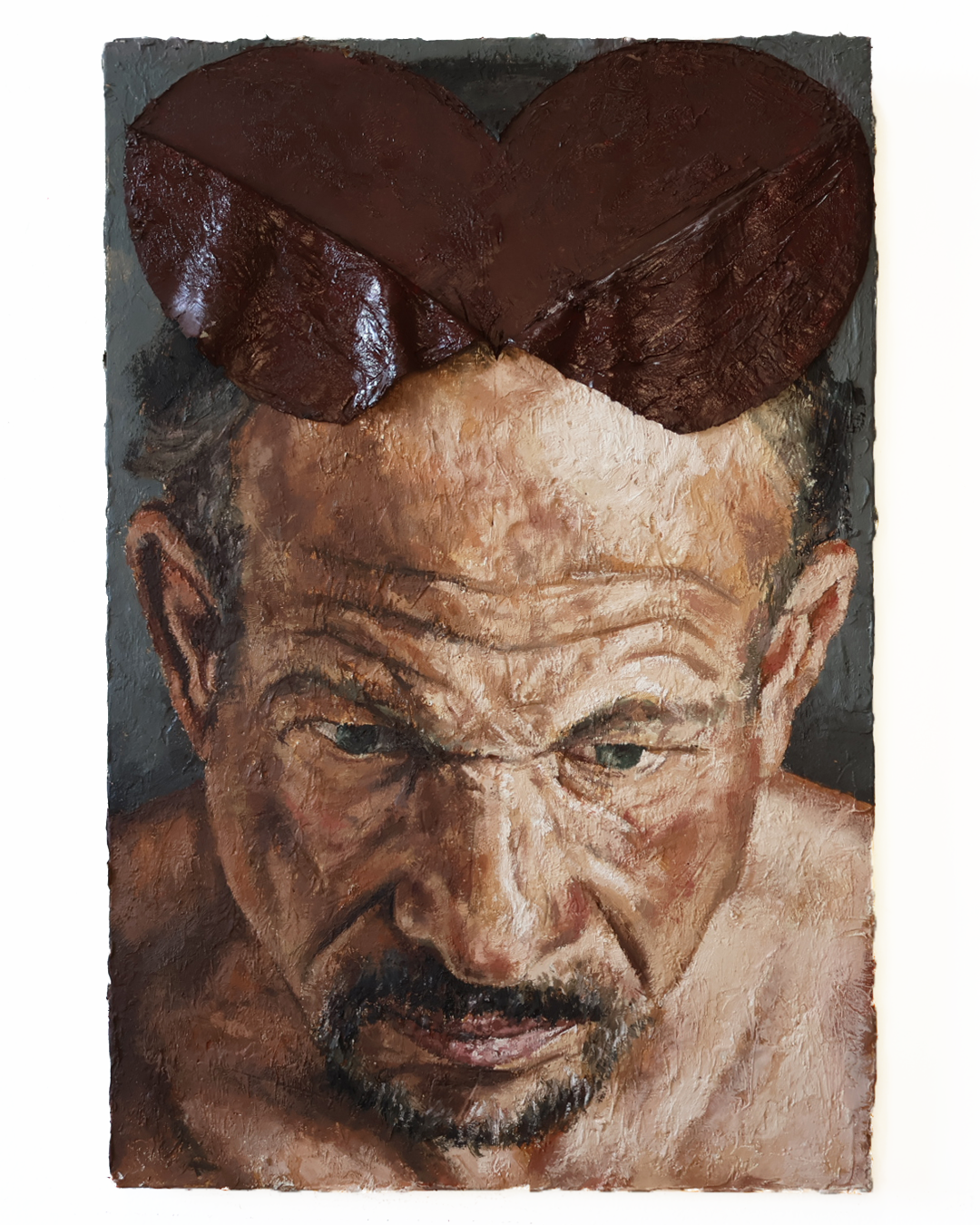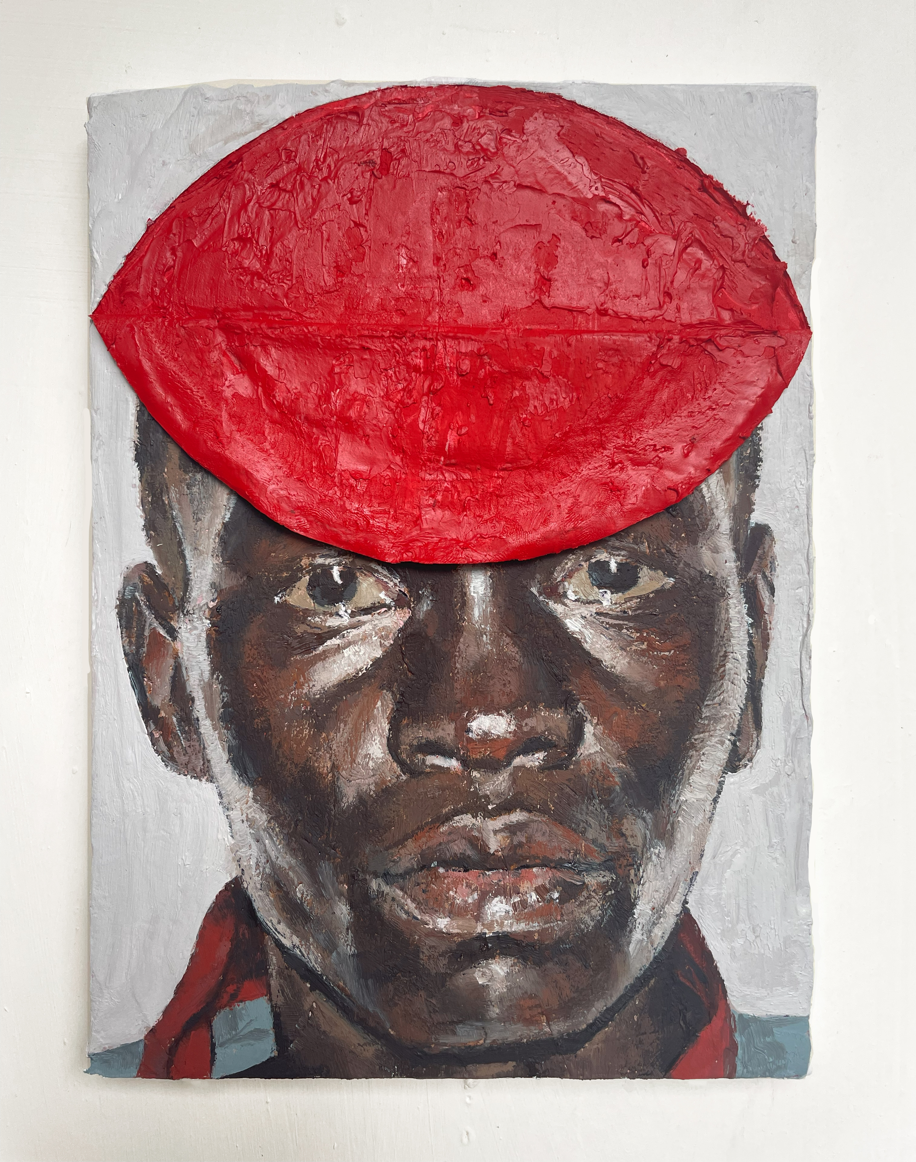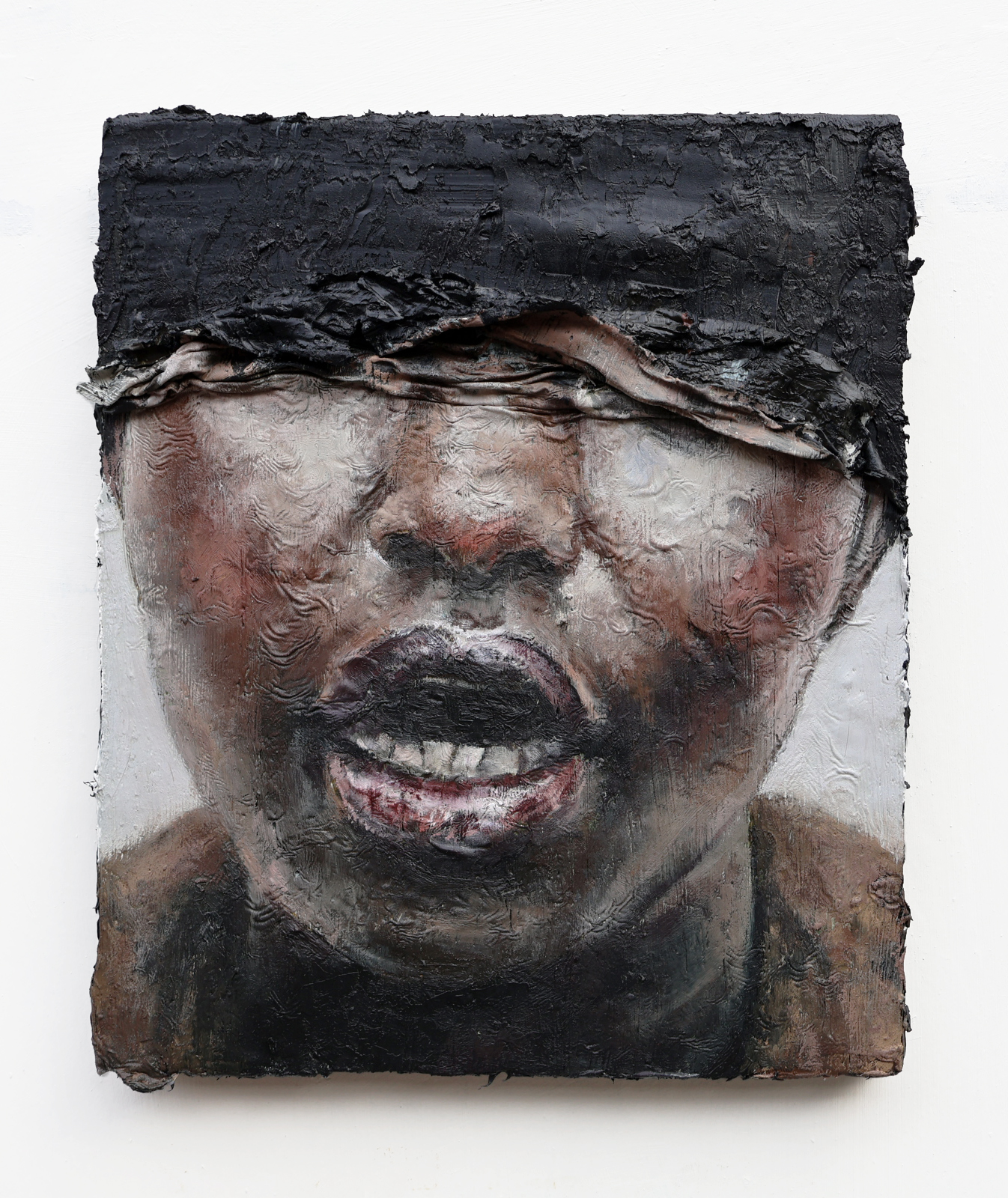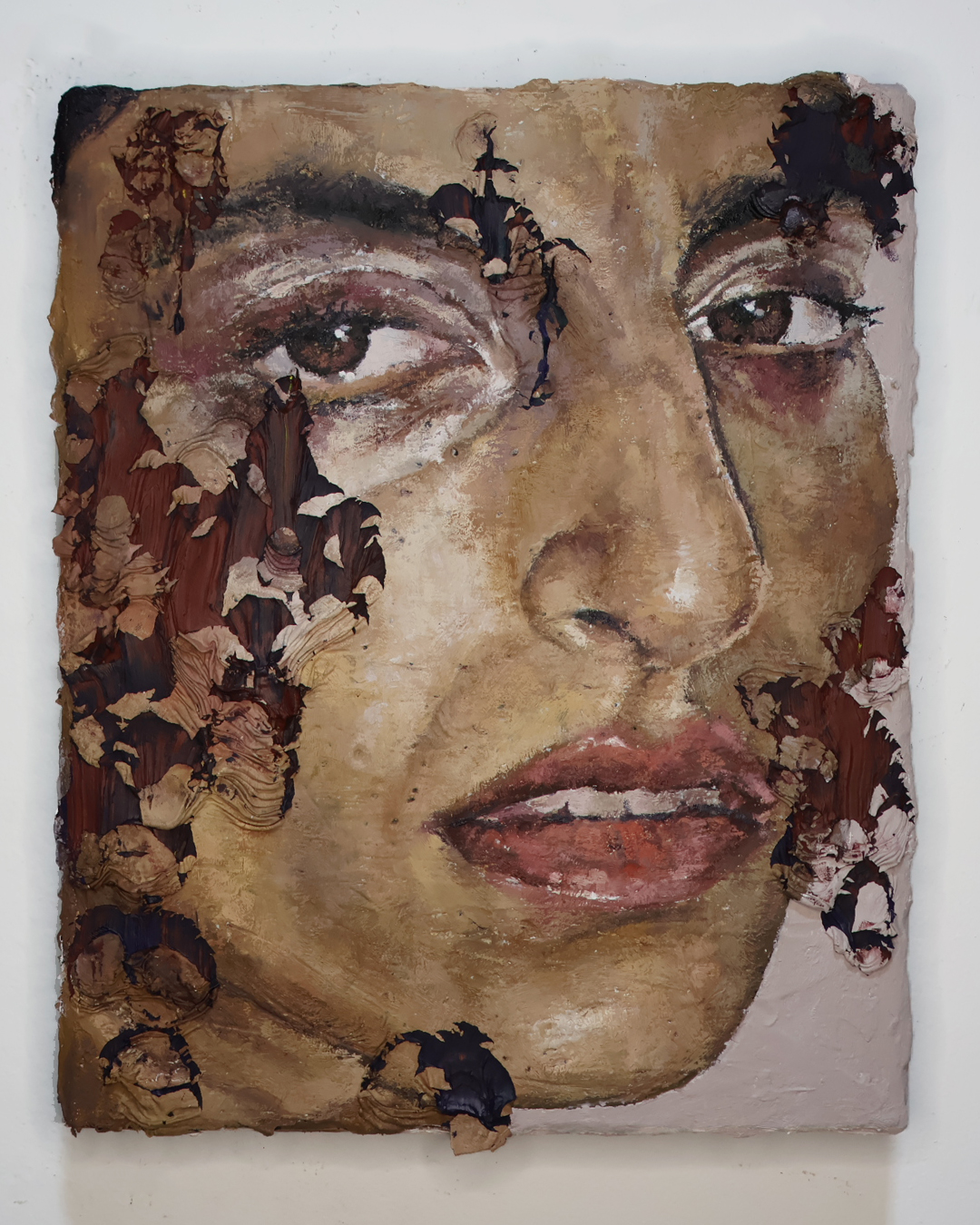 A pele, sempre em destaque, enfatiza a dimensão material e processual da pintura, na medida que é atravessada por cortes e dobras que revelam uma camada inferior, formada por tinta ainda úmida. Aparecem então, cores fortes – inclusive o vermelho, carregado de simbolismos – e as texturas marcantes, que afirmam a relação pintura-corpo, destacando a materialidade e significado da obra em si.