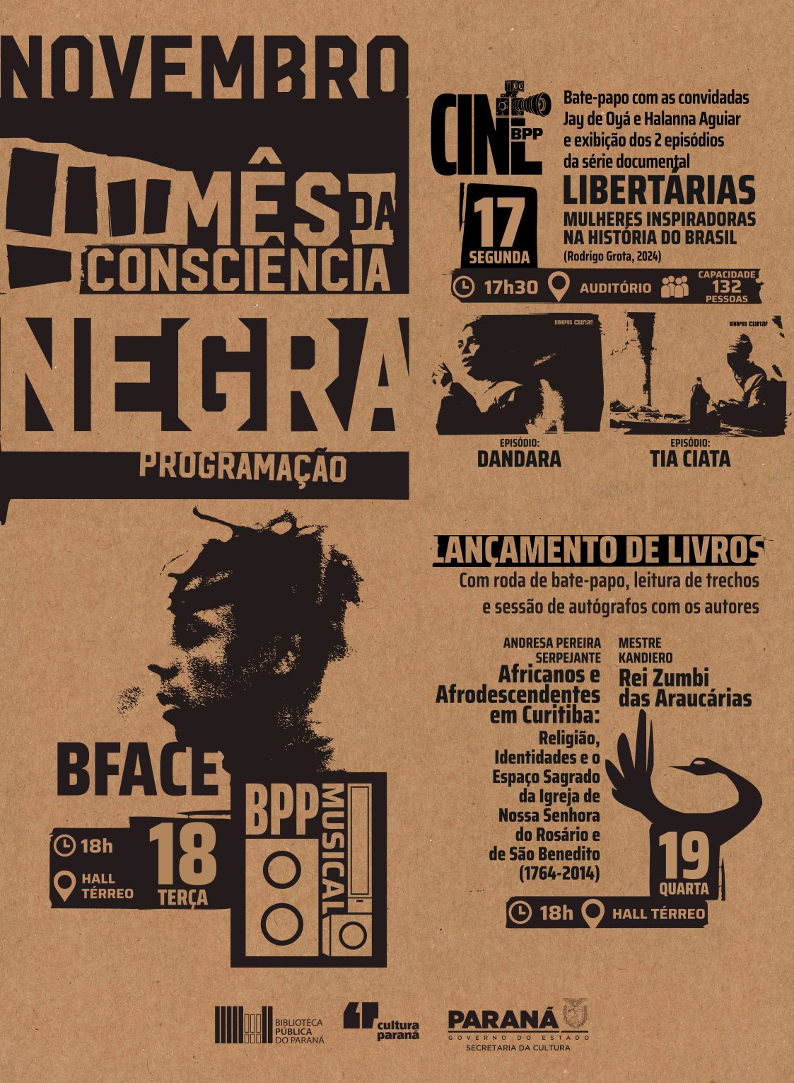 Em comemoração ao Dia da Consciência Negra, celebrado em 20 de novembro, a Biblioteca Pública do Paraná (BPP) oferece uma programação temática na semana do feriado nacional. São três eventos preparados para marcar a data: edições especiais do BPP Musical e do Cine BPP e o lançamento das obras de Mestre Kandiero e de Andresa Pereira Serpejante. As ações são gratuitas e abertas ao público, e acontecem nos dias 17, 18 e 19. A BPP estará fechada entre os dias 20 e 23, retornando as atividades na segunda-feira, 24.
